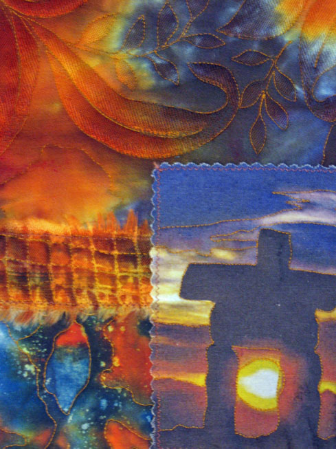 The challenge for February is to make a quilt using a split complimentary color scheme (I've used blue, red-orange and yellow-orange), and the design elements texture and balance. The group had an "Ugly Fabric" white elephant exchange in December -- so an additional challenge for February is to use some of that "ugly" fabric we each went home with. Both sections of fabric on the bottom of my quilt are part of the "ugly" fabric I had to work with.