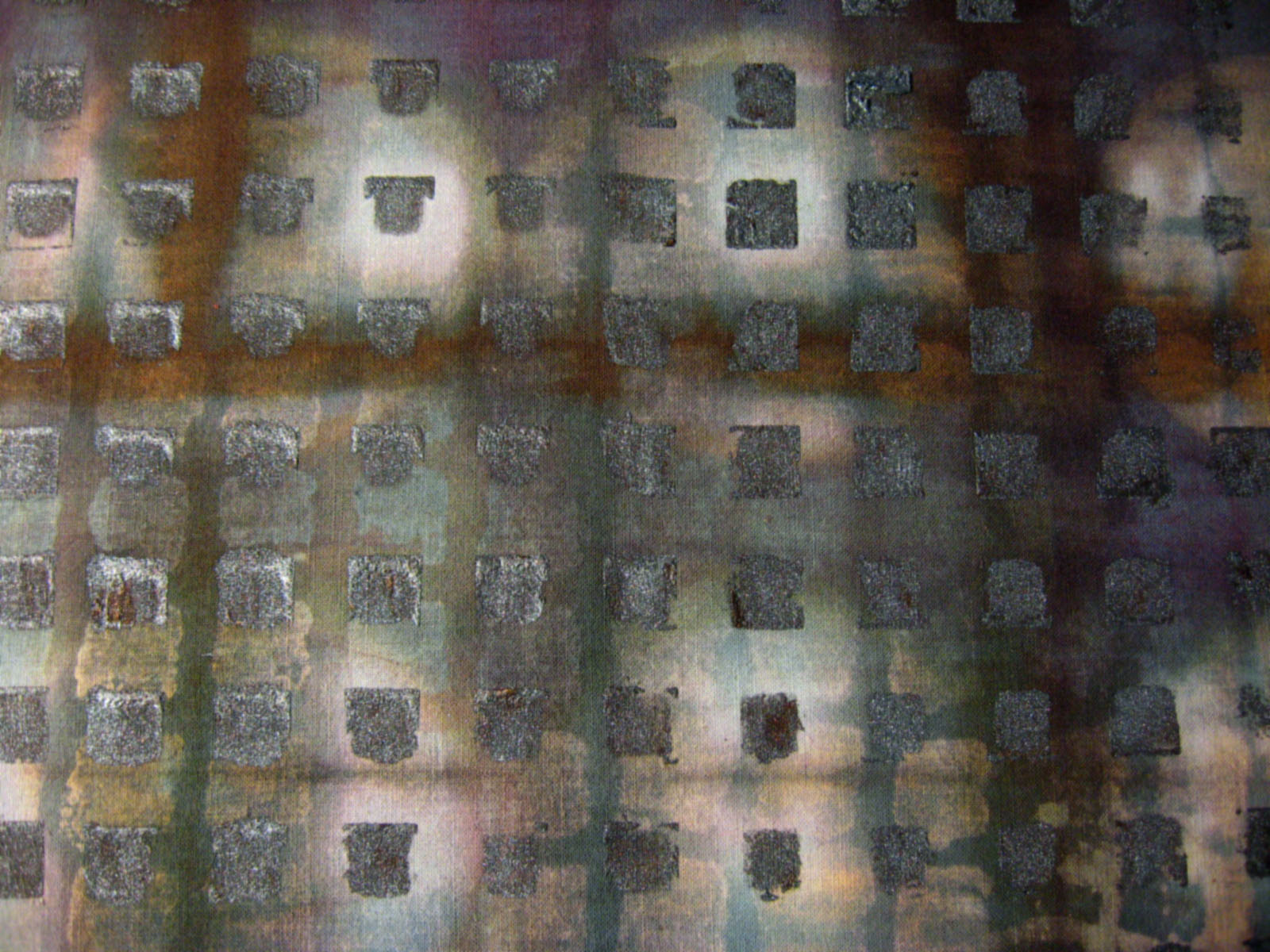 All of these fabrics -- some fat quarters, most smaller -- had previously been low-water dyed, rusted, discharged, shiboried, deconstructed screen printed or jar dyed; most have several layers.